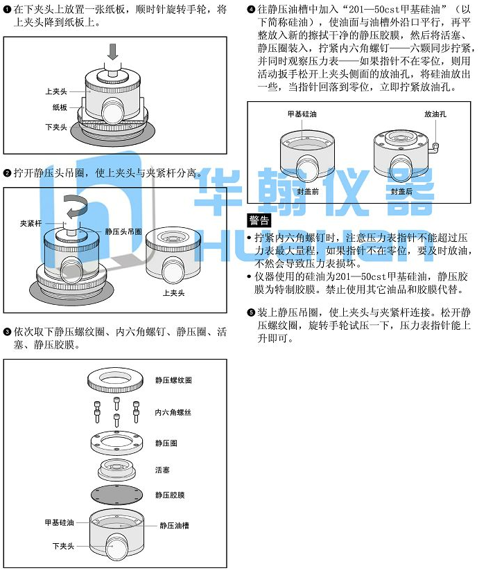 1,當(dāng)對(duì)試樣施加夾緊力時(shí)出現(xiàn)旋轉(zhuǎn)手輪的力偏重或無(wú)法達(dá)到要求的夾持力時(shí),說(shuō)明靜壓油槽中有泄油情況或靜壓膠膜破裂不產(chǎn)生靜壓力,則應(yīng)添加“201—50cst甲基硅油”或更換膠膜。